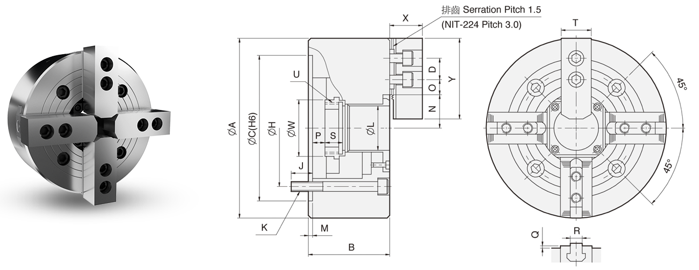 - All sliding surfaces are hardened and ground for accurate actual running and long service repeatability. Lubrication nipple in each master jaw.