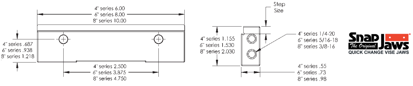 Extension Jaws are 2 inches longer for increased support. Hardened, precision ground, and available in 10 different step sizes. Expand your vise capacity with extension step jaws. To order any of these items enter the Part Number into the search bar above. (This will take you to the product page where you can add the item to the shopping cart)