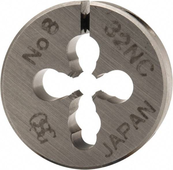 OSG - #8-32 UNC Thread, 13/16" Outside Diam High Speed Steel Round Die - 1/4" Thick, Right Hand Thread, Adjustable