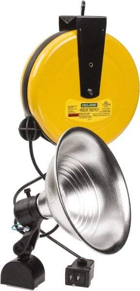 Made in USA - 18 AWG, 50' Cable Length, Cord & Cable Reel with Incandescent Hand Lamp End - 0 Outlets, 15 Amps, 110/115 Volts, SJT Cable, White/Black Reel