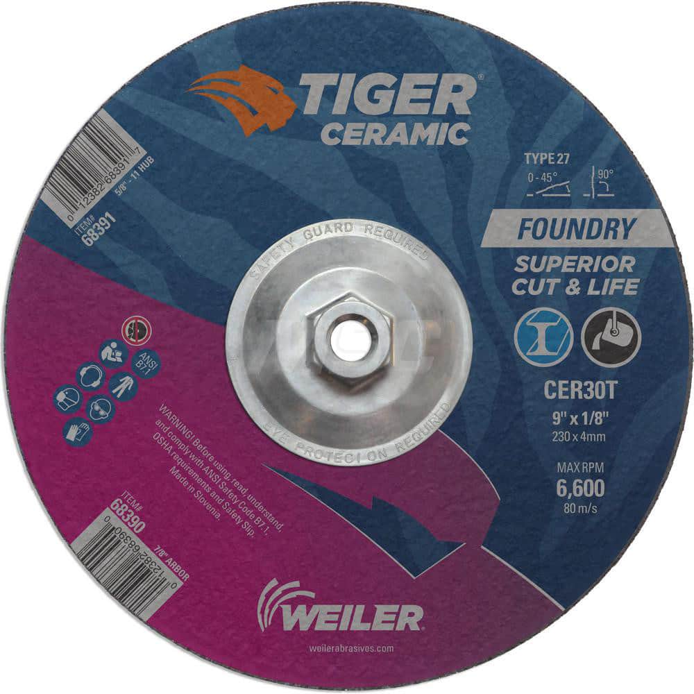 Depressed Center Wheel: Type 27, 9″ Dia, 1/8″ Thick, Ceramic Alumina 30 Grit, Resinoid, 6,650 Max RPM, Use with High Frequency Grinder, Right Angle Grinder & Air Grinder
