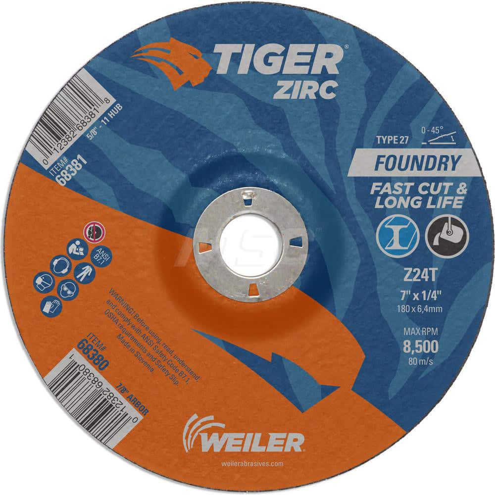 Depressed Center Wheel: Type 27, 7″ Dia, 1/4″ Thick, 7/8″ Hole, Zirconia Alumina 24 Grit, Resinoid, 8,500 Max RPM, Use with High Frequency Grinder, Right Angle Grinder & Air Grinder