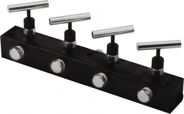 Value Collection - 3/8" Inlet, 3/8" Outlet Manifold with Four Needle Valves - 12" Long x 1.62" Wide x 4.13" High, 0.28" Mount Hole, 212°F Max, 10,000 Max PSI, 4 Inlet Ports, 4 Outlet Ports