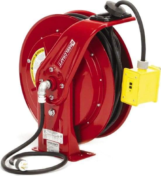 Reelcraft - 12 AWG, 100' Cable Length, Cord & Cable Reel with Duplex GFCI Outlet Box End - 2 Outlets, NEMA 5-20R, 20 Amps, 125 Volts, SEOOW Cable, Red Reel, Spring Driven Reel