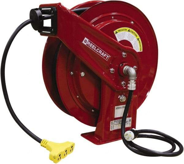 Reelcraft - 12 AWG, 75' Cable Length, Cord & Cable Reel with Triple-Tap Outlet End - 3 Outlets, NEMA 5-15R, 15 Amps, 125 Volts, SEOOW Cable, Red Reel, Spring Driven Reel