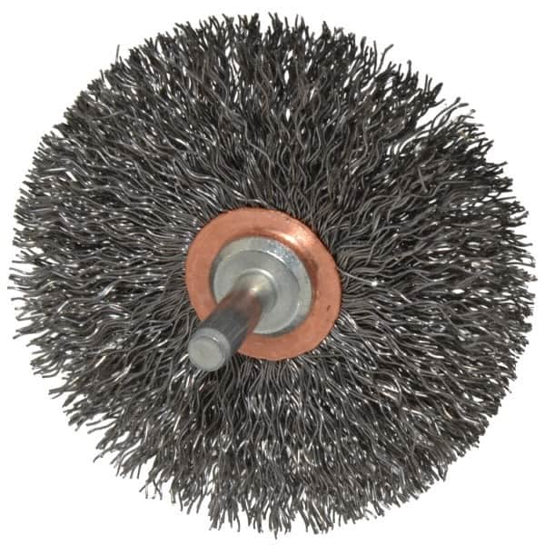 Weiler - 3" OD, 1/4" Shank Diam, Crimped Steel Wheel Brush - 1/2" Face Width, 1" Trim Length, 0.014" Filament Diam, 20,000 RPM
