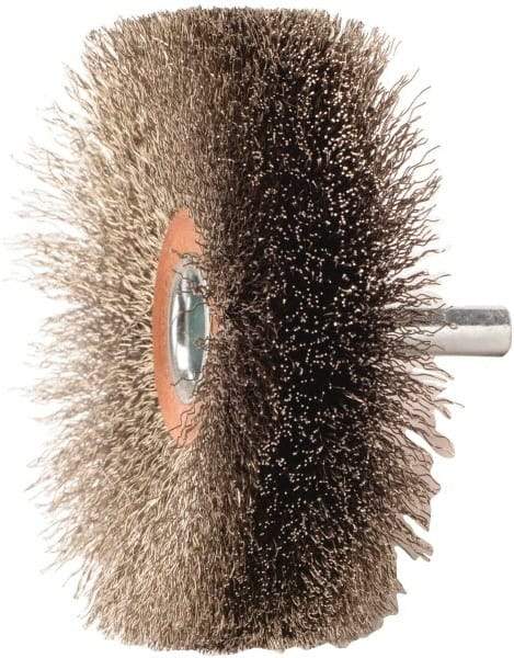 Weiler - 3" OD, 1/4" Shank Diam, Crimped Stainless Steel Wheel Brush - 1" Face Width, 15/16" Trim Length, 0.008" Filament Diam, 20,000 RPM