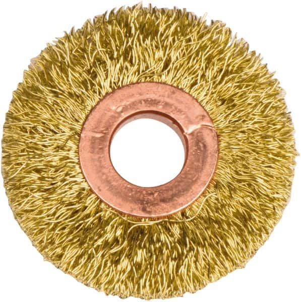 Weiler - 2" OD, 1/2" Arbor Hole, Crimped Brass Wheel Brush - 3/8" Face Width, 1/2" Trim Length, 0.0118" Filament Diam, 20,000 RPM