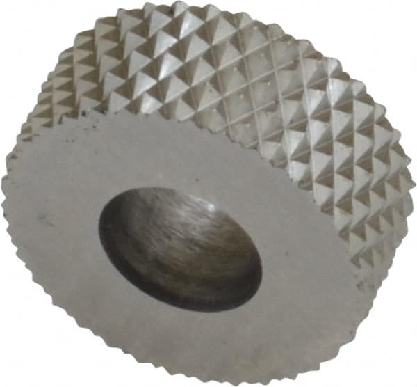Made in USA - 5/8" Diam, 90° Tooth Angle, 20 TPI, Standard (Shape), Form Type High Speed Steel Male Diamond Knurl Wheel - 1/4" Face Width, 1/4" Hole, Circular Pitch, 30° Helix, Bright Finish, Series GK
