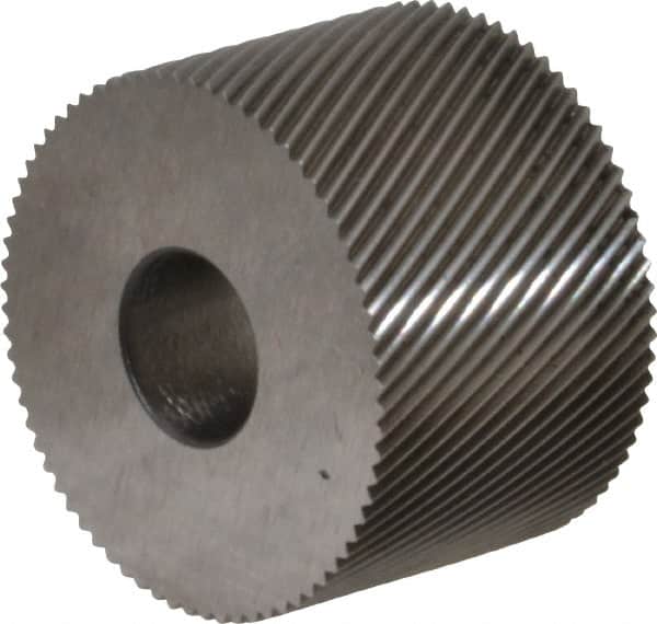 Made in USA - 3/4" Diam, 80° Tooth Angle, Standard (Shape), Form Type High Speed Steel Left-Hand Diagonal Knurl Wheel - 1/2" Face Width, 1/4" Hole, 96 Diametral Pitch, 30° Helix, Bright Finish, Series KR