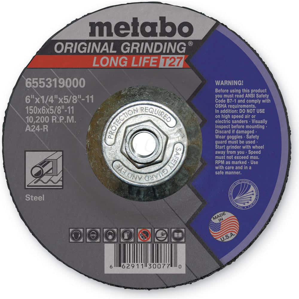 Depressed Center Wheel: Type 27, 6″ Dia, 1/4″ Thick, 5/8″ Hole, Aluminum Oxide 24 Grit, 10,200 Max RPM