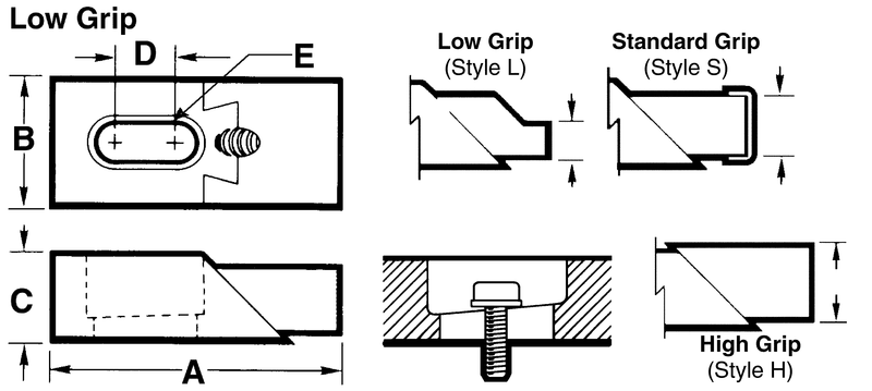*Heavy Duty Double Action Edge Clamps *Double action, adjustable nose exerts clamping forces both in and down *Low profile provides greater machining clearance *"V" groove in nose allows positive grip on round parts and corners *Removable aluminum nose cap prevents damage to work piece *Black oxide finish *Case hardened *Tapered slot prevents clamp from sliding off workpiece during tightening *Standard grip (with removable aluminum nose cap)